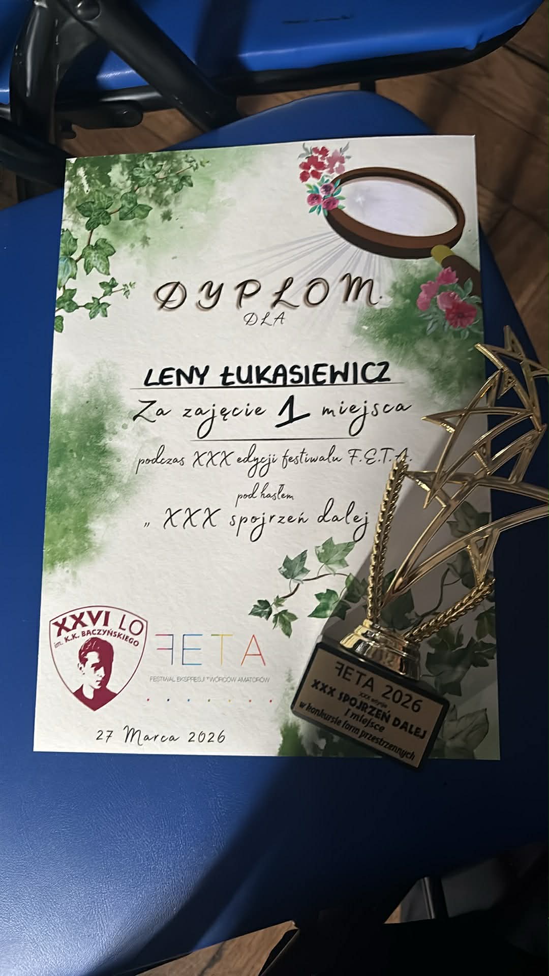 Lena Łukasiewicza, uczennica klasy 3b zajęła pierwsze miejsce na Festiwalu Ekspresji Twórców Amatorów w kategorii form przestrzennych, organizowanym przez XXVI LO im. K.K. Baczyńskiego w Łodzi. Lena, składamy Tobie gratulacje!